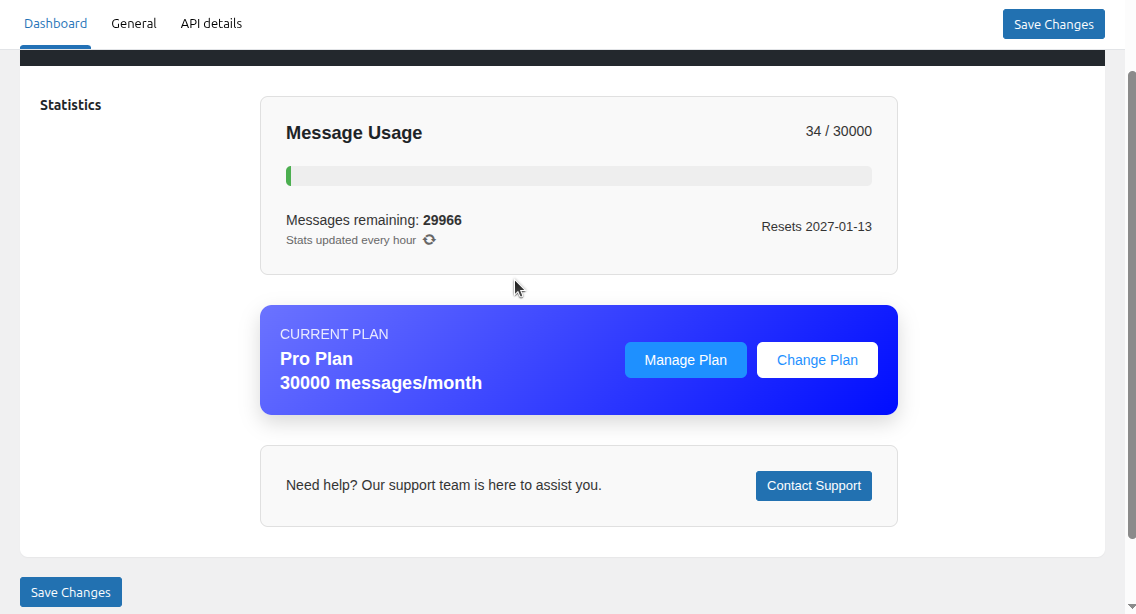 Go to Private Messaging > Dashboard to view your account status and usage statistics. This area provides insights into active conversations and your current plan details.